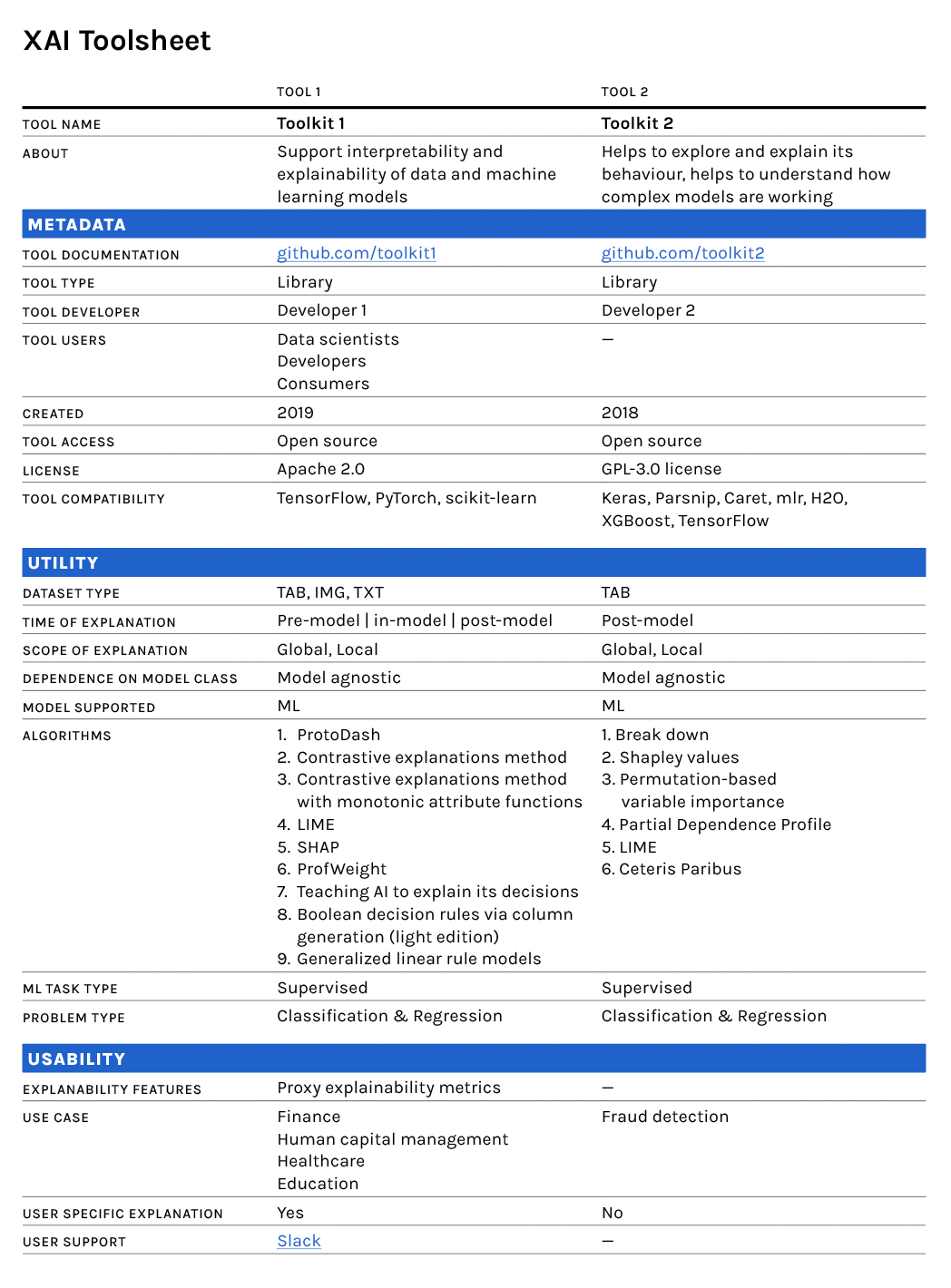 In creating this documentation framework, we were inspired by existing efforts to make the ML systems transparent and accountable through documentation. These include Gebru et al.’s Datasheets for Datasets, Bender and Friedman’s Data Statements, Holland et al.’s Data Nutrition Label, Pushkarna et al.’s Data Cards, Mitchell et al.’s Model Cards, Mathew et a.l’s FactSheets, and Procope et al.’s System Cards. While sharing similar aspirations to organize information to make ML systems more transparent, PAI’s XAI Toolsheet is distinguished from this prior work by its focus on the properties of XAI tools (as opposed to those specific to datasets or ML models). Through our original research and concepts taken from the field of UX (user experience) design, we arrived at 22 dimensions of XAI tools that would be most useful for practitioners to know when comparing them. We further classified these 22 dimensions as falling under three major categories: metadata, utility, and usability. Additionally, we propose a one-page summary format, called the XAI Toolsheet, that each XAI tool’s dimensions should be presented in.