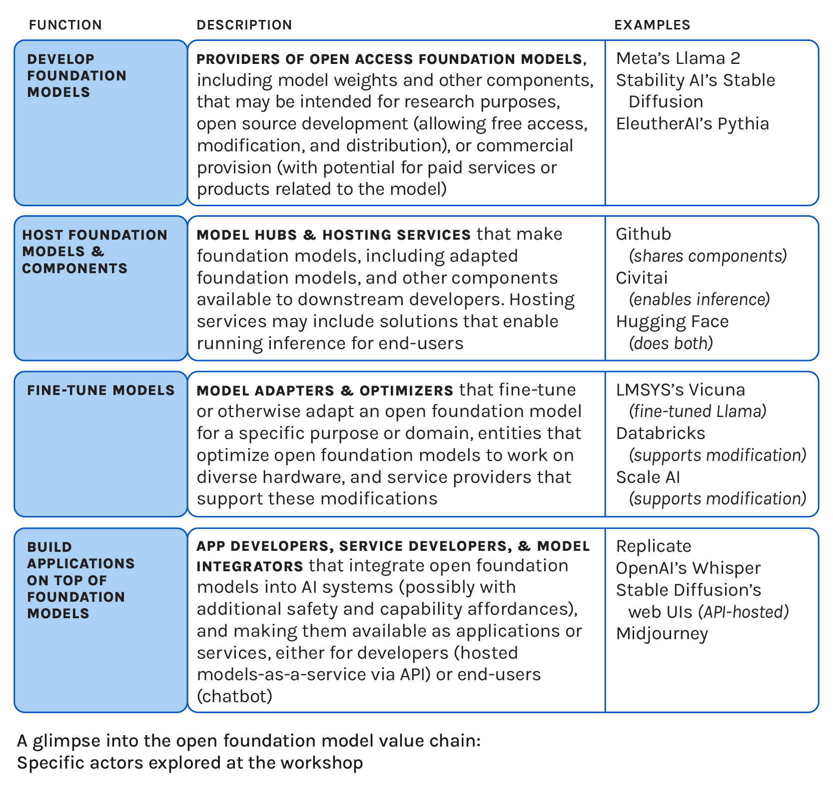 However, it is increasingly apparent that responsibility must be distributed across the value chain, since each layer has certain access and control over the resulting technology. Another key question at the workshop was: What is the value chain for open foundation model governance, and which actor(s) are best suited to implement specific guidance to address risks?