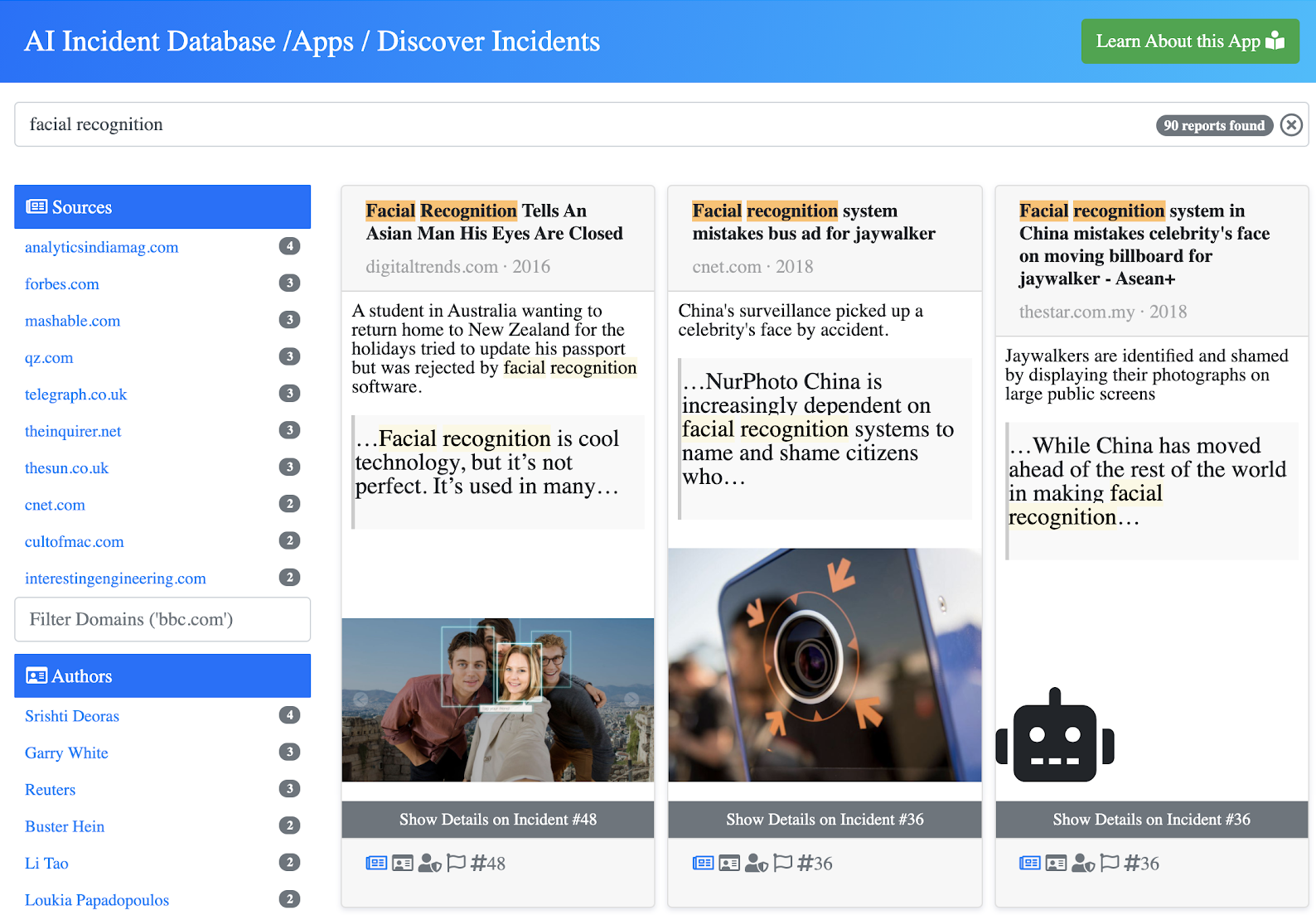 As AI technology is integrated into an increasing number of safety-critical systems — entering domains such as transportation, healthcare, and energy — the potential impact of this technology’s failures similarly grows. The AI Incident Database (AIID) is a tool designed to help us better imagine and anticipate these risks, collecting more than 1,200 reports of intelligent systems causing safety, fairness, or other real-world problems.